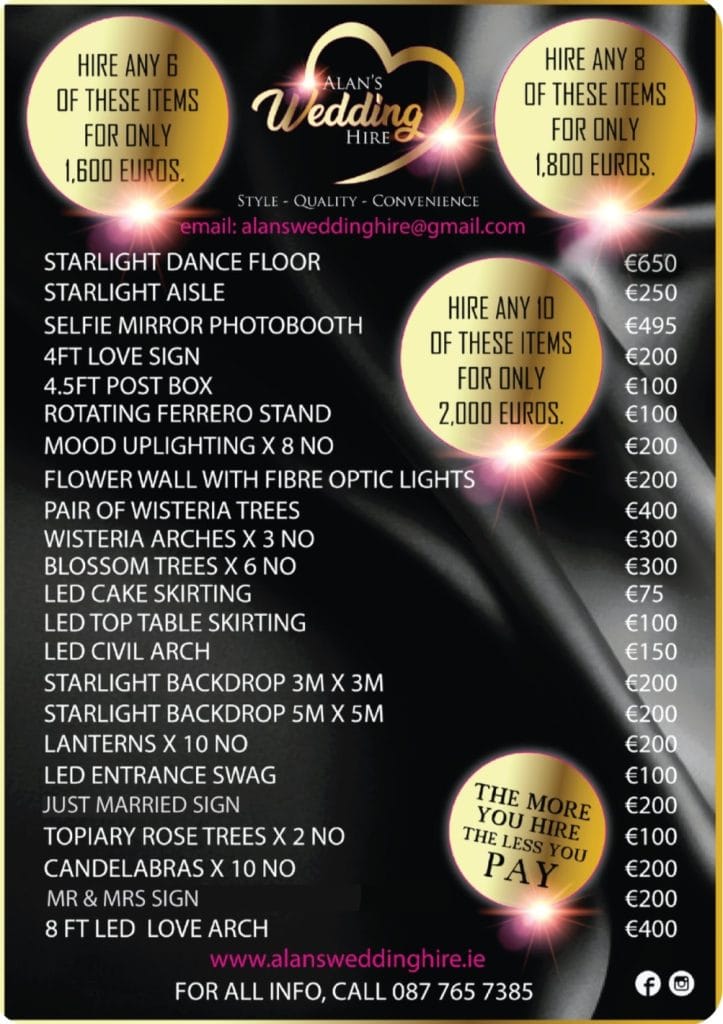 Transform your special day with Alan’s Wedding Hire’s exclusive package deals, designed to bring elegance and magic to your celebration while keeping your budget intact. Choose any 6 items from our premium collection for just €1,600, select 8 stunning pieces for only €1,800, or create the ultimate wedding atmosphere with 10 beautiful elements for just €2,000.